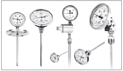 測量氣體和液體的溫度。與玻璃溫度計(jì)相比,它具有無汞損壞、讀數(shù)清晰、堅(jiān)固耐用的優(yōu)點(diǎn)。我生產(chǎn)多用途雙金屬溫度計(jì),規(guī)格品種齊全,質(zhì)量穩(wěn)定可靠,可廣泛應(yīng)用于工業(yè)、農(nóng)業(yè)、國防和科研領(lǐng)域的各個部門。雙金屬溫度計(jì)結(jié)構(gòu)特點(diǎn)和工作原理雙金屬 溫度計(jì)(以下簡稱溫度計(jì))使用螺旋加熱器雙金屬板作為溫度傳感元件,并將其安裝在保護(hù)套中,一端固定(固定端),另一端(自由端)連接到薄軸上,軸端帶有指針。當(dāng)溫度變化時,溫度傳感元件的自由端立即旋轉(zhuǎn),并通過細(xì)軸驅(qū)動指針以指示刻度盤上的溫度變化。直行溫度計(jì)通過轉(zhuǎn)向傳動機(jī)構(gòu)驅(qū)動指針。外殼材料包括鋼板、鑄造鋁合金和不銹鋼板。可調(diào)角度溫度計(jì)的頭部可借助波紋管、轉(zhuǎn)角機(jī)構(gòu)和其他部件從角度調(diào)整為直線或從直線調(diào)整為角度。